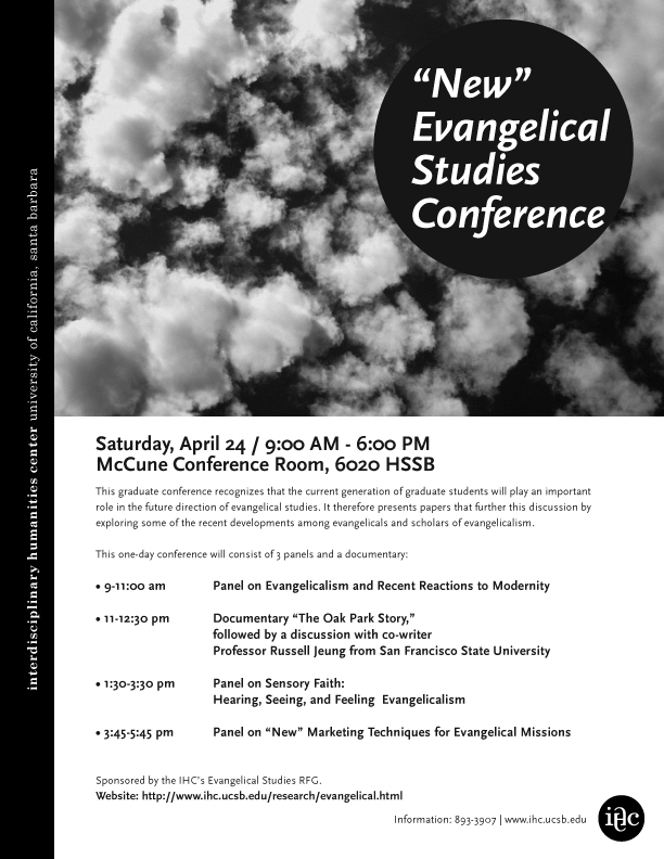 The “New” Evangelical Studies Conference was organized to build upon the conversation started at the American Academy of Religion 2009 Annual Meeting during a panel on “‘New’ Evangelical History?” Recognizing that the current generation of graduate students will play an important role in the future direction of evangelical studies, our conference called for research presentations that explored recent developments among evangelicals and scholars of evangelicalism. The conference was sponsored by the UCSB Research Focus Group on Evangelical Studies, which Kristy Slominski founded and served as convener from 2009-2010.